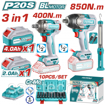Комплектация: Гайковерт TOTAL TIWLI20851 - 1 шт. Гайковерт TOTAL TIWLI20401 - 1 шт. Фонарь TOTAL TWLI35261 - 1 шт. Аккумулятор 4,0 Ач TFBLI20021 - 1 шт. Аккумулятор 2,0 Ач TFBLI20011 - 1 шт. Зарядное устройство TFCLI2001 - 1 шт. Набор ударных головок 1/2 Cr-Mo (10, 12, 13, 14, 15, 17, 19, 21, 22, 24 мм) - 10 шт. Инструкция. Коробка. Бренд: TOTAL. Производитель: TOTAL TOOLS CO. PTE. LTD, Китай, No.45 Songbei Road, Suzhou Industrial Park. Срок гарантии, мес.: 12. Сервисный центр: Сервисный центр "TEHNOZOO", г. Минск, ул. Притыцкого 62/1Тел. +375(17) 363-95-71, +375 (29) 3-629-629, +375(29) 7-629-629. Страна изготовителя: - Китай. Родина бренда: - Китай Технические характеристики: Гайковерт TOTAL TIWLI20851: Тип инструмента гайковерт. Тип двигателя бесщеточный. Тип патрона 1/2 квадрат. Питание от аккумулятора. Скорость холостого хода, об/мин 0-1600 / 0-2100 / 0-2400. Частота ударов в минуту 0-1500 / 0-1800 / 0-2200. Максимальный крутящий момент, Нм 850. Максимальный крутящий момент на откручивание, Нм 1000. Наличие подсветки да. Наличие удара да. Наличие реверса да. Поясная клипса да. Гайковерт TOTAL TIWLI20401: Тип инструмента гайковерт. Тип двигателя бесщеточный. Тип патрона 1/2 квадрат. Питание от аккумулятора. Скорость холостого хода, об/мин 0-1600 / 0-1900 / 0-2300. Частота ударов в минуту 0-2100 / 0-2500 / 0-2900. Максимальный крутящий момент, Нм 400. Максимальный крутящий момент на откручивание, Нм 550. Наличие подсветки да. Наличие удара да. Наличие реверса да. Поясная клипса да. Наличие подсветки да. Наличие удара да. Наличие реверса да. Поясная клипса да. Фонарь TOTAL TWLI35261: Тип инструмента фонарь. Питание встроенный аккумулятор. Яркость, люмен 75-300. Рассеиваемая мощность светодиода, Вт 3,5. Напряжение аккумулятора, В 3,7. Емкость аккумулятора, Ач 3,6. Кол-во светодиодов 16. Кол-во режимов 2. Время работы, ч 3,5-7. Материал корпуса пластик. Вес, кг 0,22. Тип аккумулятора Li-lon. Количество аккумуляторов в комплекте 2. Емкость аккумулятора, А*ч 2,0 / 4,0. Напряжение аккумулятора, В 20. Время зарядки аккумулятора, мин 60 / 120. Зарядное устройство в комплекте да. Совместимость аккумулятора TOTAL P20S. Параметры товара в упаковке: Габариты 476 x 423 x 87 мм. Вес нетто: 8,1 кг. Вес брутто: 8,5 кг.